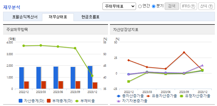 -2023년 12월 전년동기 대비 연결기준 매출액은 42.7% 증가, 영업이익 흑자전환, 당기순이익 흑자전환. 자동차용 Seat Trim Cover를 주력으로 하는 시부품사업부문 매출이 전년대비 약 80.1% 증가하면서 전체 외형 확대. 원가율 하락과 판관비 등 비용 절감에 성공하며 영업이익 흑자전환. 기타 부문 부동산 임대업은 임대수입 감소로 인하여 매출액은 전년대비 20.8% 감소하였으나 영업이익 및 당기순이익은 흑자전환.
