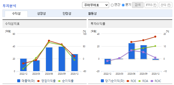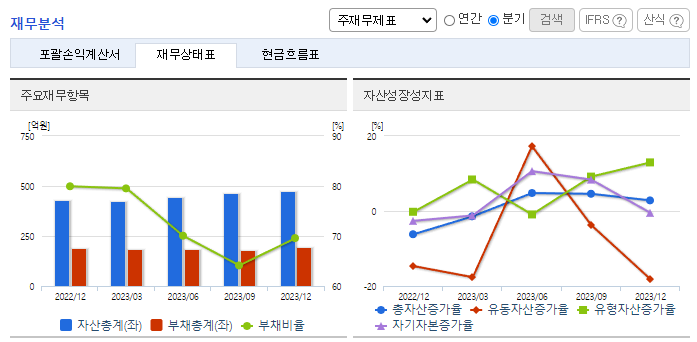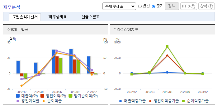 -2023년 12월 전년동기 대비 별도기준 매출액은 65.7% 증가, 영업이익은 2618.3% 증가, 당기순이익은 430.1% 증가. 매출처의 제품매출 및 로열티수익이 크게 상승하였고, 매출원가 및 판관비 비용의 감소로 매출액과 영업이익 성장을 이루어냄. 2024년에는 인천광역시 남동공단에 본사 및 신공장 완공이 예정되어 있어, 생산 캐파가 확대되어 향후 추가적인 매출 상승을 견인할 수 있을 것으로 예상됨.