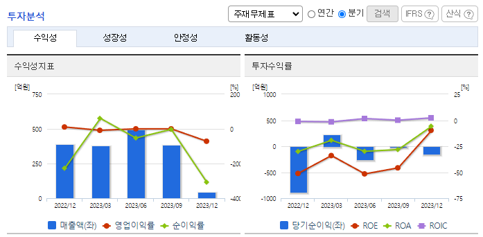 -2023년 12월 전년동기 대비 연결기준 매출액은 3.2% 증가, 영업이익 적자전환, 당기순손실은 80% 감소. 2023 사업연도 감사인의 감사보고서상 감사의견이 '의견거절'임을 공시(2024.3.21)하였음. 상기 사유는 상장폐지 사유에 해당되어 동사는 2024년 4월 12일 상장폐지에 대한 이의신청서를 제출하였으며, 그 결과 2024년 4월 16일까지 개선기간을 부여하기로 결정되었음.