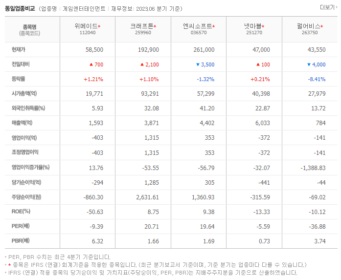 -2023년 6월 전년동기 대비 연결기준 매출액은 5.5% 증가, 영업손실은 210.3% 증가, 당기순손실은 73.3% 증가. 신작 나이트 크로우의 활약에 힘입어 매출액이 5.5% 증가했으나, 신작 마케팅에 사용된 비용이 급등하면서 영업손실도 대폭 커짐. 동사가 만든 암호화폐 위믹스는 현재 다시 국내 코인시장에 복귀했으나, 가격이 한창 높을 때 대비해 현재 가격은 여전히 낮은 수치를 기록 중임.