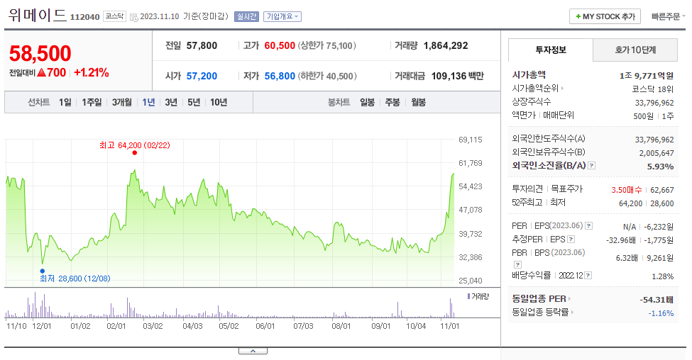 위메이드 현재 주가는 58,500원이며 전일 대비 +700(+1.21%) 원의 모습을 보이고 있습니다. 위메이드의 주주현황을 살펴보면 박관호(외 1인)가 지분 42.43%를 소유하고 있습니다. 위메이드는 게임 소프트웨어 기업으로 장중 기준으로 주가는 57,800원입니다. 위메이드의 시가 총액은 1조 9771억 원이며 발행 주식수는 33,796,962주입니다. 외국인 보유 비중은 5.93%이며 장중 거래량은 1,864,292를 기록했습니다. 23년 2분기 매출액은 1,593억 원, 영업이익은 -403억 원을 달성했으며, EPS는 -860원입니다. 위메이드 주식 배당수익률은 1.28%입니다.