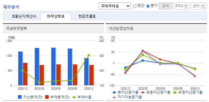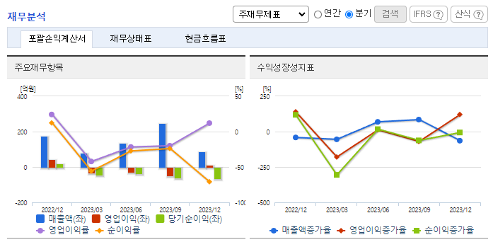 -2023년 12월 전년동기 대비 연결기준 매출액은 35% 감소, 영업손실은 36.1% 감소, 당기순손실은 14.7% 증가. 주력사업인 수배전반류 제품 매출이 크게 부진하며 외형이 축소됨. 매출 감소에도 불구하고 원가율 하락과 판관비, 인건비 등 비용 감소로 영업적자폭은 소폭 축소. 전직 대표이사 횡령·배임 혐의 발생으로 상장적격성 실질 심사를 받고 있어 거래 정지된 상태.