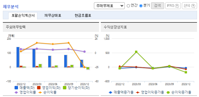 -2023년 12월 전년동기 대비 연결기준 매출액은 12.2% 감소, 영업손실은 753.1% 증가, 당기순손실은 502.2% 증가. 경기 침체로 인해 매출은 감소했고, 신규 설립한 자회사들의 초기 투자비용과 일회성 비용 증가 및 인플레이션으로 인한 원가부담으로 영업손실의 적자폭은 크게 확대됨. 동사의 자사 플랫폼은 지속적인 회원유입을 통하여 2023년 9월 말 기준 약 331만 명의 회원을 통하여 높은 재구매율을 보이고 있음.
