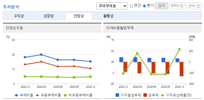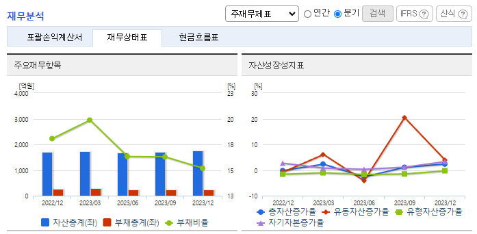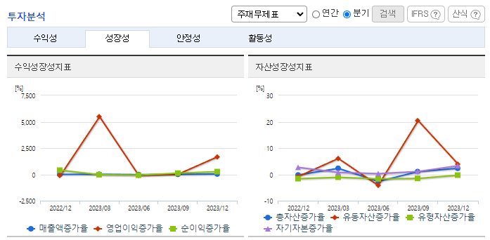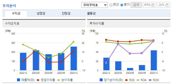 -2023년 12월 전년동기 대비 연결기준 매출액은 3% 증가, 영업이익은 49% 증가, 당기순이익은 2.2% 증가. 주력인 화성사업부문이 다소 부진했지만 금융투자 호조와 의료사업부문 실적 개선으로 외형 성장에 성공. 원가율 절감 노력으로 영업이익도 개선. 의료사업부문에서 수입사(STRYKER)와 시장점유율 1위인 Tornier 어깨관절 제품을 2022년 하반기부터 총판 계약을 하고 있음.