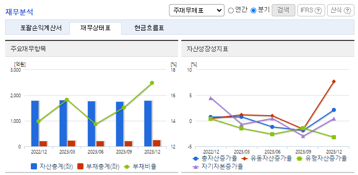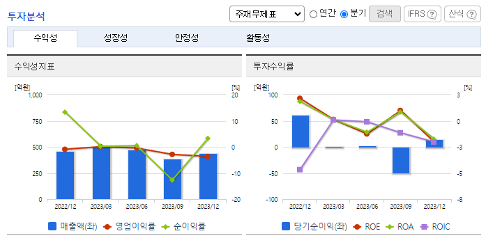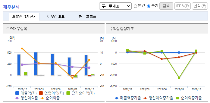 -2023년 12월 전년동기 대비 별도기준 매출액은 8.1% 감소, 영업이익 적자전환, 당기순이익 적자전환. 제품이 전반적으로 판매단가가 낮아짐에 따라 마봉 매출의 경우 19%, 선재 매출의 경우 12% 감소했음. 이에 따라 영업이익 적자 전환함. 동종업계의 설비 중복 투자로 인한 공급 과잉현상이 심화됨. 이에 따라 단가 인하 및 저가품 시장에서의 판매 경쟁 심화가 두드러짐.