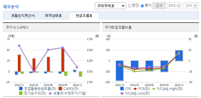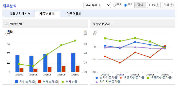 -2023년 12월 전년동기 대비 별도기준 매출액은 2.8% 감소, 영업손실은 103.3% 증가, 당기순손실은 95.1% 증가. 레자 신규 시설투자에 따른 감가상각비 및 부대비용 증가로 당기순손실은 22억원으로 전기 대비 적자폭이 증가하였음. 동사는 자동차 인조가죽 부문의 매출 증대와 생산효율 증대, 품질경쟁력 확보 등을 하고자 2022년부터 시작한 신설비 투자를 마무리하였으며 금년부터는 그 효과를 기대하고 있음.
