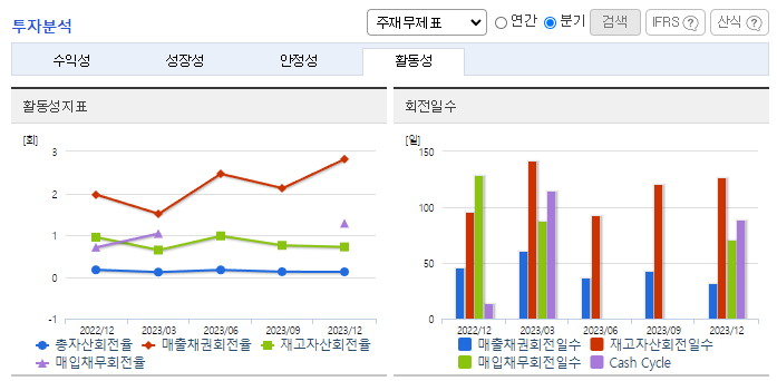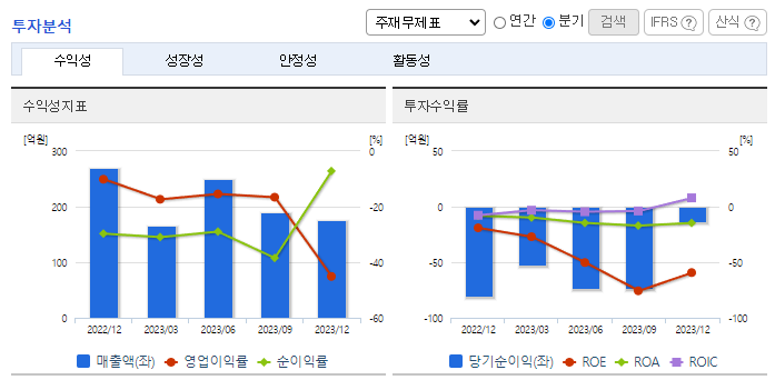 -2023년 12월 전년동기 대비 연결기준 매출액은 33% 감소, 영업손실은 109.5% 증가 수출물량의 급감으로 외형 크게 축소된 상황이며, 이의 영향으로 수익성 또한 크게 악화되어 영업손실 폭 대폭 확대된 모습. 언더본 타입의 125cc 차량과 ADV 350cc 고배기량 스쿠터 등의 개발에 집중하고 있으나, 유럽시장의 불경기 지속되고 있어 단기간내 급격한 실적 개선은 어려울 전망.