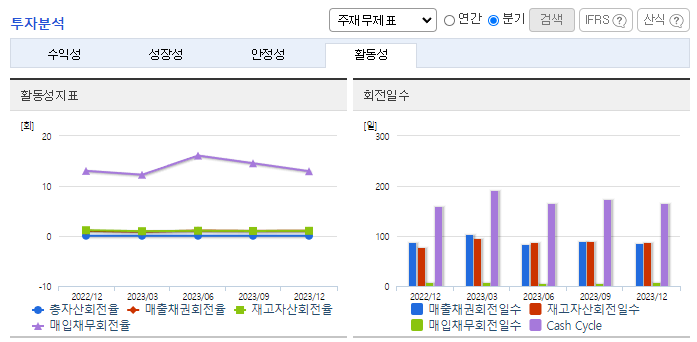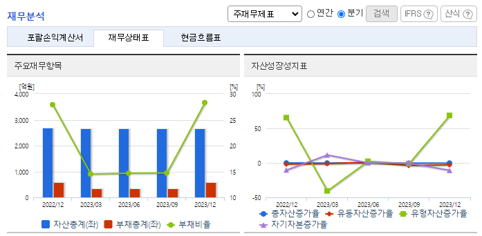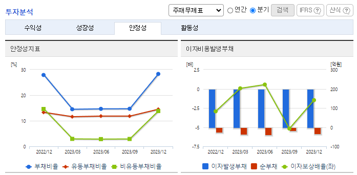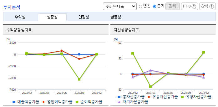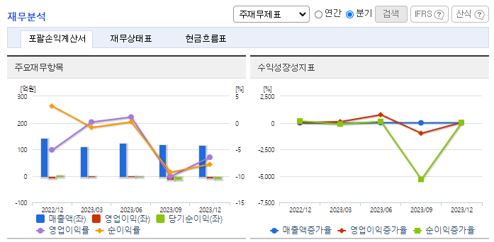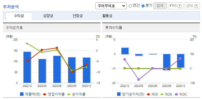 -2023년 12월 전년동기 대비 연결기준 매출액은 19.5% 감소, 영업손실은 105.2% 증가, 당기순손실 또한 크게 증가. 국내외 염색 및 섬유산업의 불황이 지속되면서 해외 및 국내 동반하여 부진한 실적을 기록하였으며, 이의 영향으로 수익성 또한 큰 폭으로 하락한 모습. 빠른 시일 안에 시장상황 회복되기는 쉽지 않을 것으로 보이며, 적극적인 비용관리를 통해 수익성 개선 노력 필요한 상황.