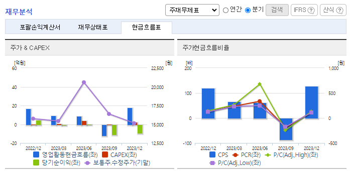 -2023년 12월 전년동기 대비 연결기준 매출액은 19.5% 감소, 영업손실은 105.2% 증가, 당기순손실 또한 크게 증가. 국내외 염색 및 섬유산업의 불황이 지속되면서 해외 및 국내 동반하여 부진한 실적을 기록하였으며, 이의 영향으로 수익성 또한 큰 폭으로 하락한 모습. 빠른 시일 안에 시장상황 회복되기는 쉽지 않을 것으로 보이며, 적극적인 비용관리를 통해 수익성 개선 노력 필요한 상황.