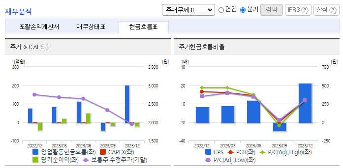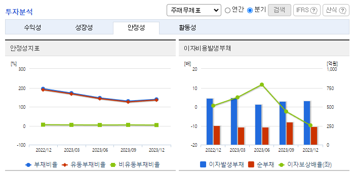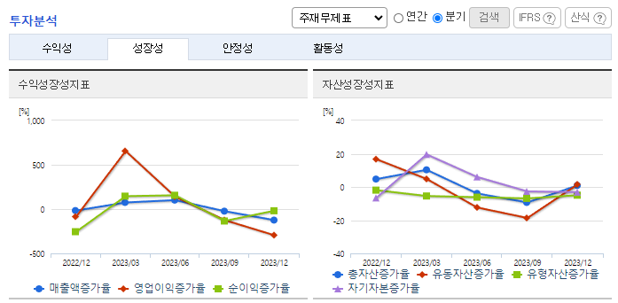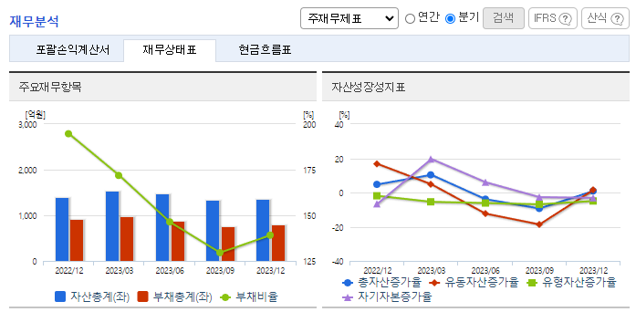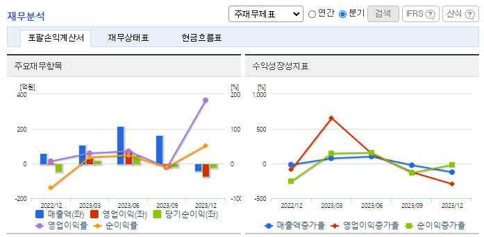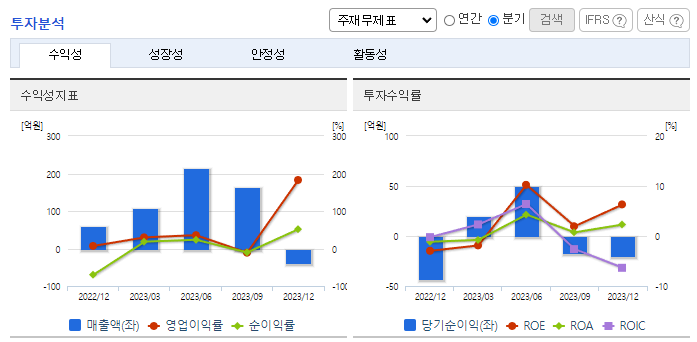 -2023년 12월 전년동기 대비 연결기준 매출액은 52.6% 증가, 영업이익은 81.4% 감소, 당기순이익 흑자전환. 드라마 콘텐츠 제작 매출이 크게 성장하여 전반적인 매출액 상승. 특히 국내 매출의 증가세가 돋보임. 다만 매출원가가 큰 폭으로 상승하여 수익성은 악화. 다년간 축적한 콘텐츠 라이브러리 기반으로 일본 방송사 및 OTT플랫폼 등 공급 채널 확장 및 콘텐츠 공급 규모 확대하였음.