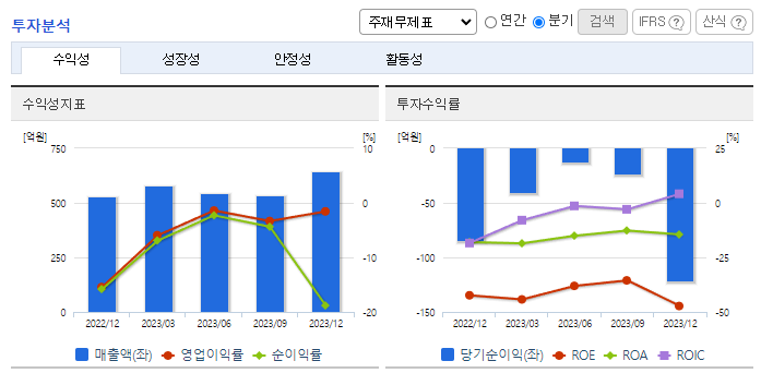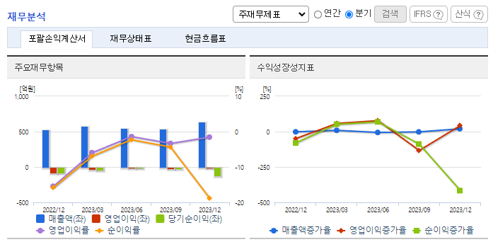 -2023년 12월 전년동기 대비 연결기준 매출액은 12% 증가, 영업손실은 70.3% 감소, 당기순손실은 16.2% 감소. 매출이 두 자릿수 비율로 늘어난 반면 매출 원가는 5.9% 증가에 그쳤음. 동시에 판매비와 관리비도 효율적으로 집행, 수익성이 큰 폭으로 개선됐음. 동사는 B2B에 치우친 수익구조에서 소비자 접점을 늘리는 B2C 사업으로 매출 비중을 확대하기 위하여 오프라인 매장을 확대하는 등 노력하고 있음.