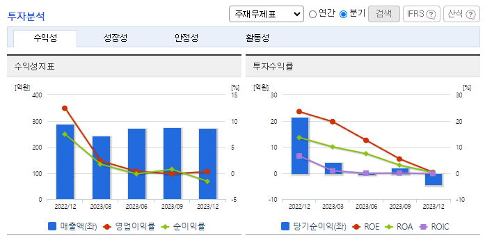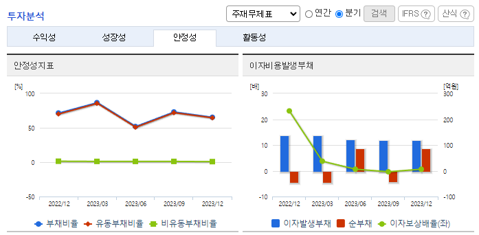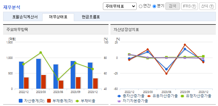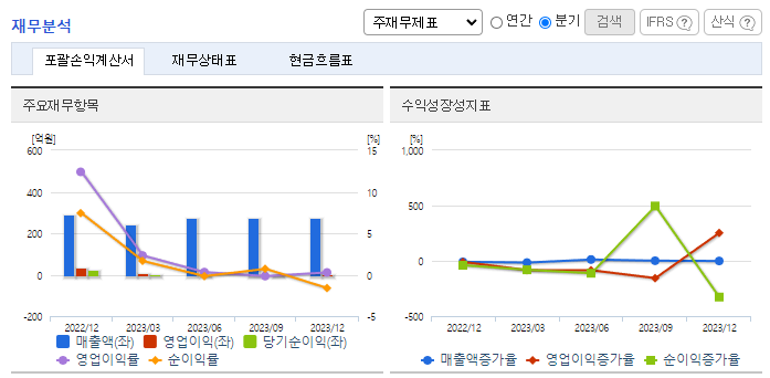 -2023년 12월 전년동기 대비 별도기준 매출액은 15.1% 감소, 영업이익은 95.3% 감소, 당기순이익은 99% 감소. 단기 차입금 상환으로 인한 재무구조 개선으로 인한 자산의 감소와 철강 경기 침체로 인한 매출액, 영업이익 감소를 나타내고 있음. 총판매 중 약 80%가 내수용으로 최근 무역장벽에 따른 수출 판매가 어려운 가운데에서도 안정적인 시장을 확보하고 있는 상황임.