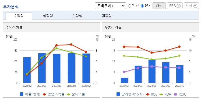 -2023년 12월 전년동기 대비 연결기준 매출액은 3.4% 증가, 영업이익은 20.4% 증가, 당기순이익은 4.9% 증가. 판관비는 부대 비용 지출 증가로 인해 증가하였고, 기타 수익의 증가는 정규직 전환지원금 등 증가로 인한 것이며, 기타 비용의 감소는 기타 부대비용의 지출 감소에 의한 것임. 폴리우레탄폼 사업은 국내시장의 전반적인 소비 및 투자 심리 위축과 중국등의 설비확대로 중국산 등 저가제품의 국내 유입이 증가하는 추세임.