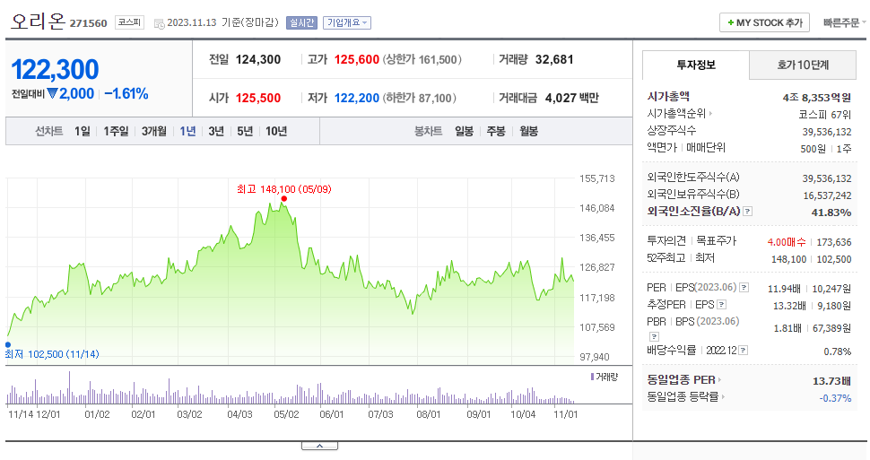 오리온 현재 주가는 122,300원이며 전일 대비 -2,000(-1.61%) 원의 모습을 보이고 있습니다. 오리온의 주주현황을 살펴보면 오리온홀딩스(외 6인)가 지분 43.80%를 소유하고 있습니다. 오리온은 식료품 기업으로 장중 기준으로 주가는 124,300원입니다. 오리온의 시가 총액은 4조 8353억 원이며 발행 주식수는 39,536,132주입니다. 외국인 보유 비중은 41.83%이며 장중 거래량은 32,681를 기록했습니다. 23년 2분기 매출액은 7,139억 원, 영업이익은 1,122억 원을 달성했으며, EPS는 2,062원입니다. 오리온 주식 배당수익률은 0.78%입니다.
