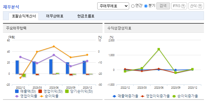 -2023년 12월 전년동기 대비 별도기준 매출액은 15.9% 감소, 영업손실은 54.5% 증가, 당기순손실은 94% 감소. 신규사업인 식품사업의 매출은 전년 대비 소폭 늘었지만 주요 사업부문인 자동차부품 사업부문의 매출은 주요 매출처인 한국 GM과 HD현대인프라코어의 매출감소로 부진. 적자폭 확대됨. 2023년 12월 이탈리아의 유명 젤라또 브랜드인 '사몬타나(Sammontana)'의 국내 독점 공급 계약을 체결