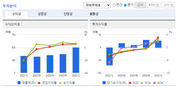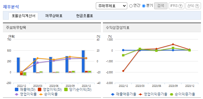 -2023년 12월 전년동기 대비 연결기준 매출액은 18.4% 증가, 영업이익 흑자전환, 당기순이익 흑자전환. 전년동기 대비 조선산업 수주액과 매출액 증가의 영향으로 매출액이 소폭 상승했고 원가율 개선과 판관비, 인건비 등 비용 절감에 성공하며 영업이익이 흑자전환함. 방위산업 부문은 장기 프로젝트가 대부분으로 수주 잔고는 꾸준하게 증가하는 중. 조선시장 역시 수주액 증가추세를 보이며 회복세가 뚜렷한 점도 동사에 호재.