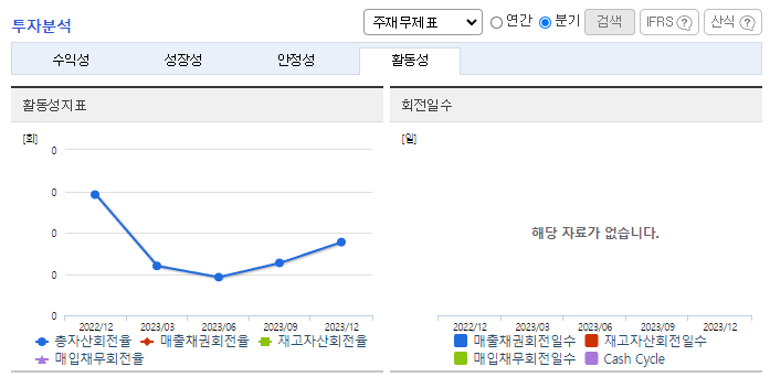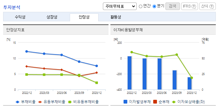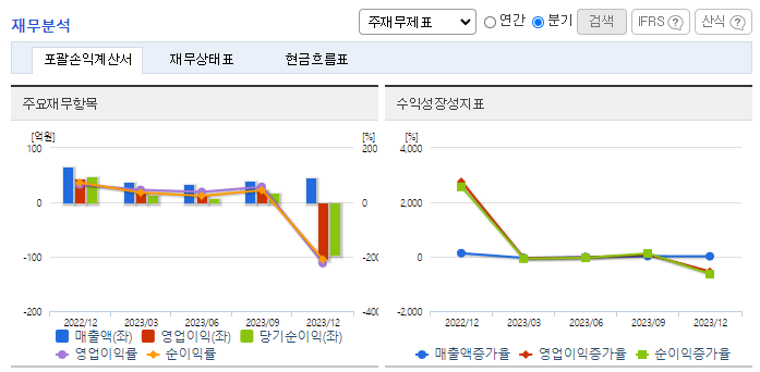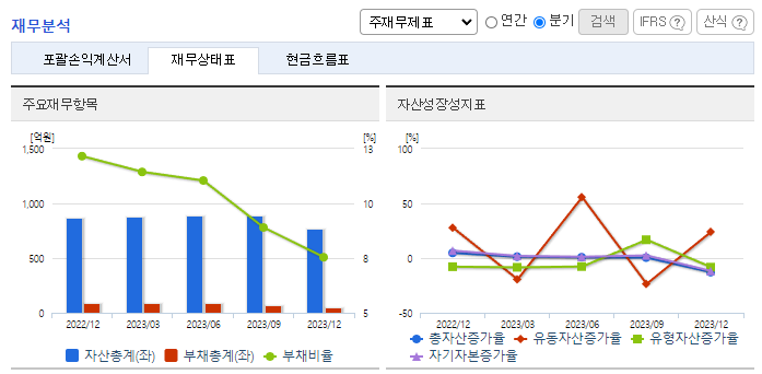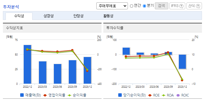 -2023년 12월 전년동기 대비 별도기준 매출액은 0.1% 증가, 영업이익 적자전환, 당기순이익 적자전환. 신규 펀드의 결성으로 인해 전년 대비 3.21억 원 증가하였으나 투자심리 위축 및 피투자기업의 실적부진으로 인하여 운영조합이 투자한 업체의 가치하락 반영으로 영업이익이 감소. 조합출자금의 분배금 수취를 통해 증가된 현금유입을 차입금의 상환에 사용함에 따라 장, 단기 차입금이 감소하였음.