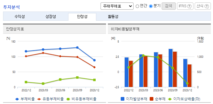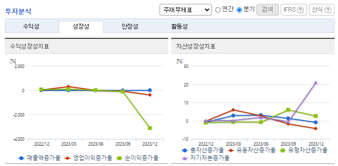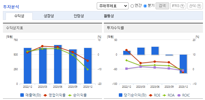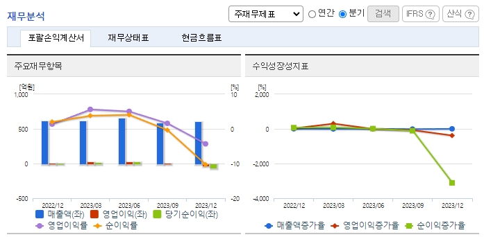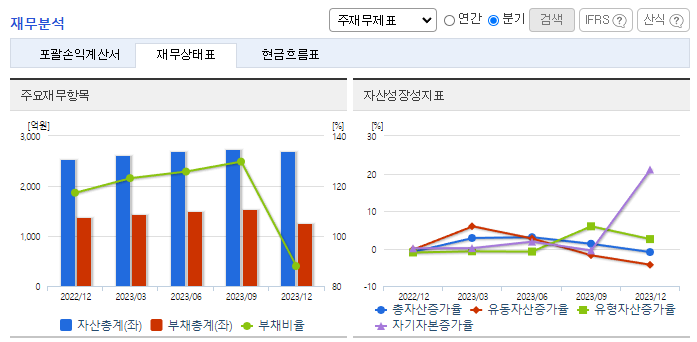 -2023년 12월 전년동기 대비 연결기준 매출액은 1.2% 증가, 영업이익은 54.6% 감소, 당기순이익 적자전환. 연결 매출액은 2484억원으로 전년과 비슷한 수준이지만, 상품매출 원가율 상승과 판매관리비 증가 등 수익성 악화로 인해 영업이익은 전년 대비 62억 원 감소함. 생산성 향상과 원가절감, 고부가가치 제품 개발은 물론이고, 자회사인 한선엔지니어링의 지속적인 성장과 기성금속 경영정상화를 통해 수익성을 개선할 계획임.
