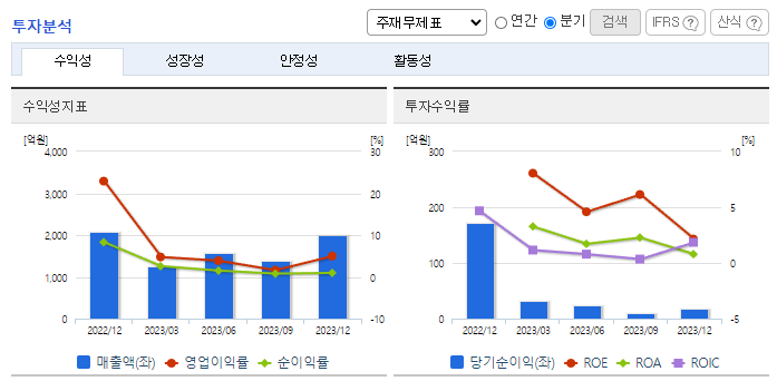 -2023년 12월 전년동기 대비 연결기준 매출액은 14.8% 감소, 영업이익은 59.5% 감소, 당기순이익은 78.3% 감소. 외형이 큰 폭으로 축소된 가운데 원가율은 다소 악화되었으며, 고정비 부담과 인건비 등이 커짐에 따라 영업이익이 절반 이상 줄어들었음. 건축, 토목, 기타(부동산임대업 외) 등 동사의 주요 사업 중 건축공사가 약 3,768억, 전체 매출액 대비 60.62%로 가장 큰 비율을 차지하고 있음.
