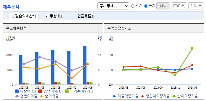 -2023년 12월 전년동기 대비 연결기준 매출액은 5.5% 감소, 영업이익은 45.9% 감소, 당기순이익은 56.9% 감소. 2023년 중 생산설비 CAPA 증대 등에 1조 191억 원을 사용하였으며, 향후 주력사업의 시장 지배력 확대와 중장기 육성 신사업 중심으로 투자를 계획하고 있음. 2024년에는 긴축 완화, AI 확산에 따른 전자부품의 수요 회복도 기대하고 있음.