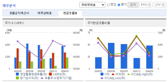 -2023년 12월 전년동기 대비 연결기준 매출액은 5.5% 감소, 영업이익은 45.9% 감소, 당기순이익은 56.9% 감소. 2023년 중 생산설비 CAPA 증대 등에 1조 191억 원을 사용하였으며, 향후 주력사업의 시장 지배력 확대와 중장기 육성 신사업 중심으로 투자를 계획하고 있음. 2024년에는 긴축 완화, AI 확산에 따른 전자부품의 수요 회복도 기대하고 있음.