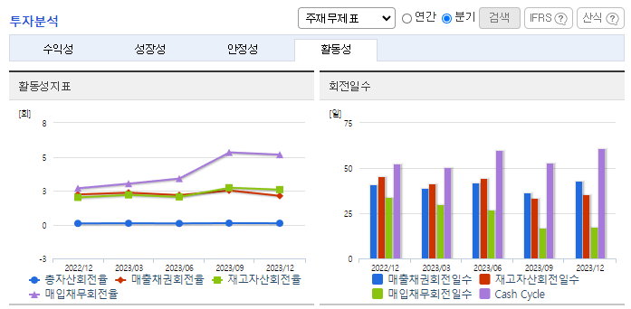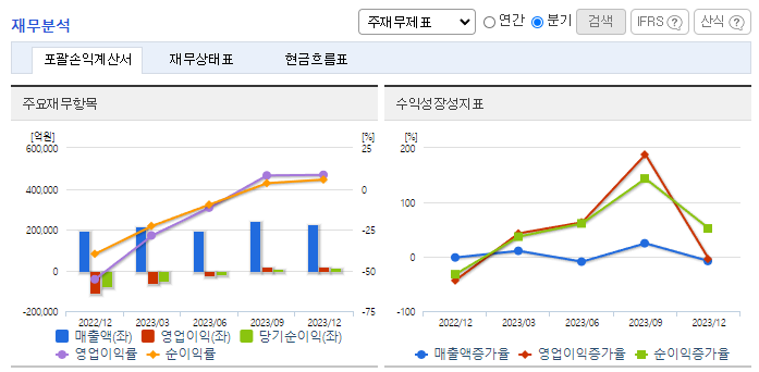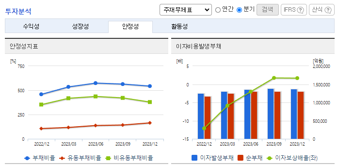 -2023년 12월 전년동기 대비 연결기준 매출액은 23.8% 증가, 영업손실은 86.1% 감소, 당기순손실은 80.3% 감소. 판매량은 소폭 감소하였으나, 요금조정으로 판매단가가 상승하여 매출액은 전년보다 20% 넘게 증가하는 호조세를 보임. 재무적인 측면에서는 연결기준 부채비율 543.3%, 자기 자본비율 15.5%, 매출원가율 101.7%를 기록하는 등 어려움을 겪고 있음.