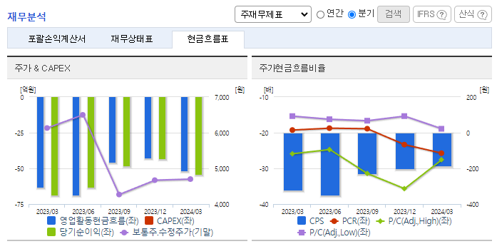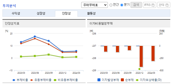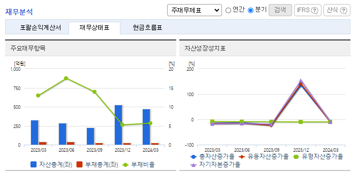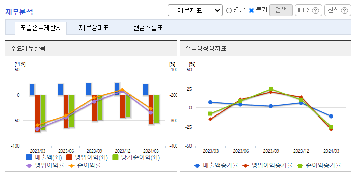 -2023년 12월 전년동기 대비 연결기준 매출액은 6.6% 증가, 영업손실은 15.5% 감소, 당기순손실은 17% 감소. 매출이 소폭 늘고 판매비와 관리비는 전년 대비 줄면서 수익성 소폭 개선됐음. 다만 여전히 적자 상태. 연구개발총괄부문에서 First in class의 신규 기전 항암치료제를 개발하는데 주력하고 있으며, 개발이 완료된 비항암 프로그램들(결핵, 아토피)은 이전을 통한 수익창출을 앞두고 있음.