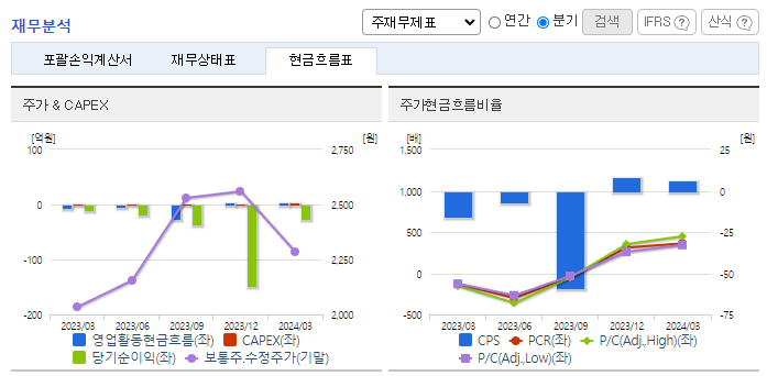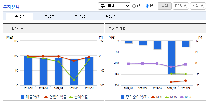 -2023년 12월 전년동기 대비 연결기준 매출액은 2.9% 증가, 영업손실은 136.2% 증가, 당기순손실은 293.8% 증가. 자동차 시장의 전기차 및 친환경 차량의 공급 증가로 인하여 동사 상품 중 BPS, SLS 등의 매출이 확대되었으나, 높은 원가율과 판관비가 뇌관임. 한화시스템과의 공급계약 건 관련 매출 달성률은 약 20%(27억)로 불성실공시법인 지정이 될 가능성을 배제할 수 없음.