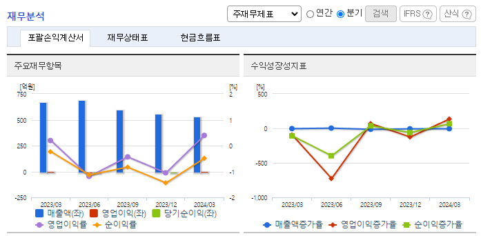 -2023년 12월 전년동기 대비 별도기준 매출액은 2.6% 감소, 영업이익 적자전환, 당기순이익 적자전환. 글로벌 경기 부진과 금리인상의 영향이 본격화 돼 국내 소비, 투자 등의 둔화로 경기가 위축되면서 영업활동에 어려움을 겪으며 실적 저하됨. 동사는 특수금속 소재인 티타늄, 니켈합금 사업에도 진출하여 석유화학, LNG, 담수화설비 등에 산업용 소재를 공급하고 있음.