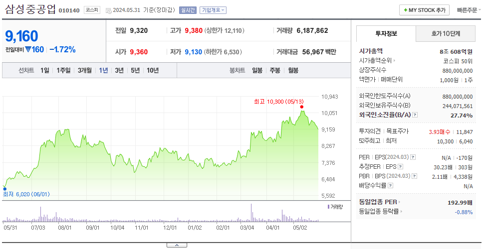 삼성중공업은 조선 기업으로 장중 기준으로 주가는 9,160원입니다. 삼성중공업의 시가 총액은 8조 608억 원이며 발행 주식수는 880,000,000주입니다. 외국인 보유 비중은 27.74%이며 장중 거래량은 6,187,862를 기록했습니다. 24년 1분기 매출액은 23,478억 원, 영업이익은 779억 원을 달성했으며, EPS는 11원입니다. 삼성중공업 주식 배당수익률은 없습니다.