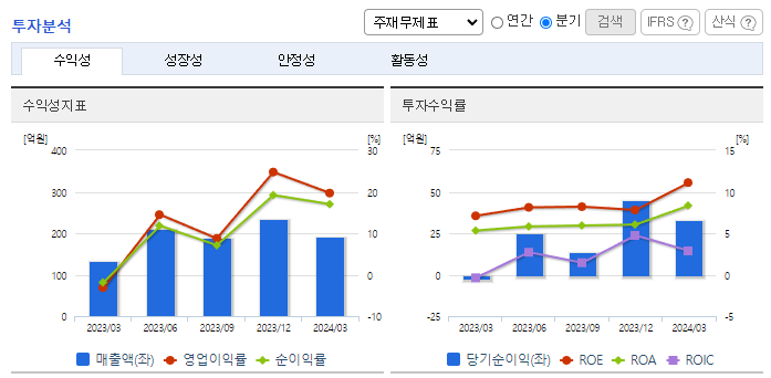 -2023년 12월 전년동기 대비 별도기준 매출액은 25.4% 감소, 영업이익은 104.8% 증가, 당기순이익은 37.5% 증가. 유럽 95.8%, 남아메리카 등에 4.19%로 수출이 대부분이며 시장침체로 매출은 감소하였으나 공정개선에 따른 생산성 향상으로 비용은 크게 감소하여 수익성이 매우 증가하였음. 동사 주력 매출은 이미페넴과 에르타페넴으로서 기타 항생제에 비하여 항균력이 탁월하여 높은 가격을 형성하고 있음.