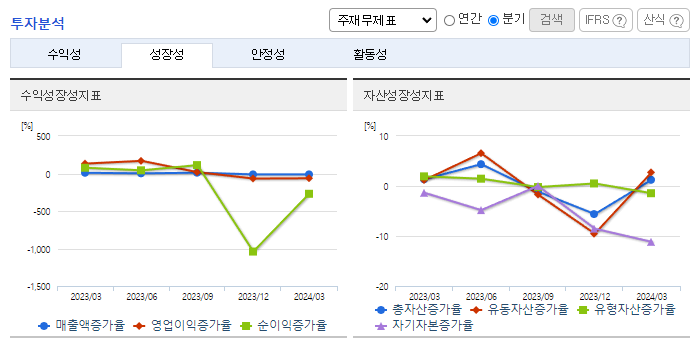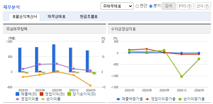 -2024년 3월 전년동기 대비 연결기준 매출액은 11.7% 감소, 영업이익은 61.4% 감소, 당기순손실은 124.4% 증가. 매출 중 69%를 해외에서 실현할 정도로 수출의존도가 높은 상황이나 세계정세 및 금리 불안정이 악영향을 미쳐 매출이 감소하였음. 탄탄한 레퍼런스를 바탕으로 시장을 확대해 나가고 있으며 특히 코로나 19 이후 중국에서는 건강기능식품에 대한 수요 증가와 온라인 직구 채널이 활성화되어 성장기회를 노리고 있음.