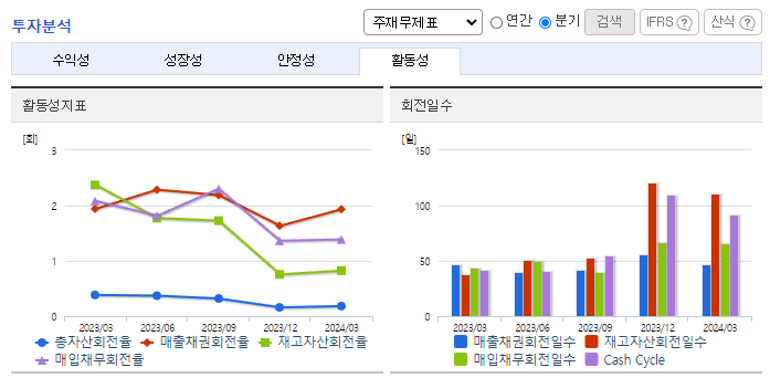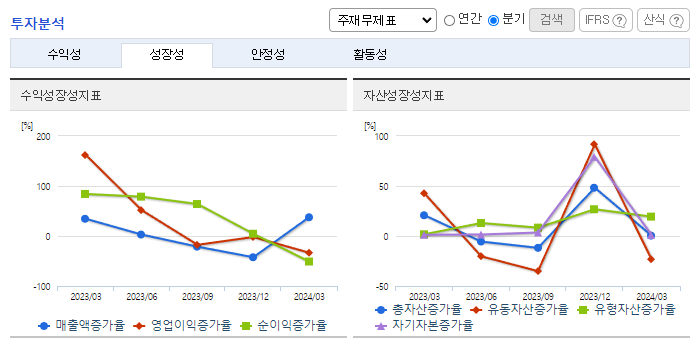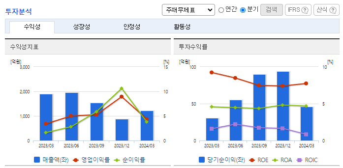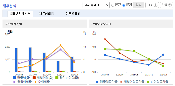-2024년 3월 전년동기 대비 별도기준 매출액은 35.9% 감소, 영업이익은 18.4% 감소, 당기순이익은 49.9% 증가. 매출 대부분이 수출에서 발생하는 사업구조임. 주력제품인 양극활물질 및 기능성필름의 수출이 감소. 반면 원재료가 하락으로 수익성은 상대적으로 적게 하락한 모습. 복합기 기종 토너개발 및 마케팅에 집중하고 있으며, 고부가가치 제품 개발에 총력을 기울이고 있음.