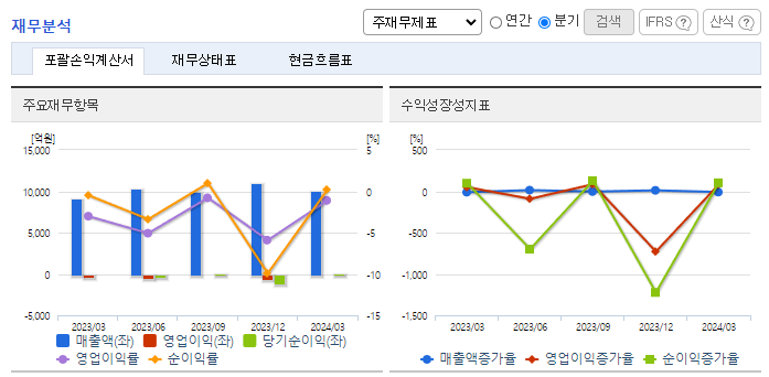 -2023년 12월 전년동기 대비 연결기준 매출액은 8.7% 증가, 영업손실은 40.2% 증가, 당기순손실은 220.6% 증가. 조선부문에서 건조물량이 증가됨에 따라 전년 대비 매출이 8.7% 증가. 조선업 인력난으로 인한 외작단가, 노무비, 물류비 증가 등으로 비용이 크게 늘며 영업적자 폭이 확대. 최근 대규모 수주 및 조선 사업부문의 가동률이 높은 것으로 미루어 보아 추후 수익성 개선이 전망되는 중