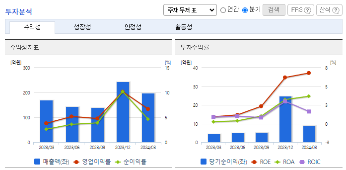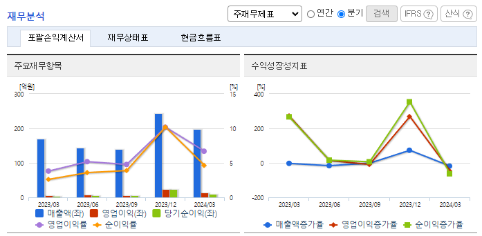 -2023년 12월 전년동기 대비 연결기준 매출액은 5.6% 감소, 영업이익은 876.7% 증가, 당기순이익은 921.1% 증가. 생산성 향상으로 인한 원가율 감소로 영업이익, 법인세차감전 계속사업이익, 당기순이익 모두 크게 증가. 최근 개발된 자연소재의 친환경 블록인 생태소일블록을 적용하여 한 단계 높은 자연형 하천 조성이 가능하게 됨에 따라 환경부 환경영향평가 등에서 우수한 소재로 평가받아 시장 저변확대 기대됨.