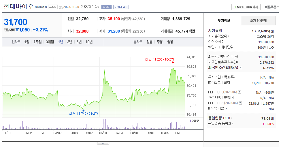 현대바이오 현재 주가는 31,700원이며 전일 대비 -1,050(-3.21%)원의 모습을 보이고 있습니다. 현대바이오의 주주현황을 살펴보면 씨앤팜(외 4인)이 지분 12.91%를 소유하고 있습니다. 현대바이오는 개인생활용품 기업으로 장중 기준으로 주가는 32,750원입니다. 현대바이오의 시가 총액은 1조 2620억 원이며 발행 주식수는 39,810,008주입니다. 외국인 보유 비중은 6.71%이며 장중 거래량은 1,389,729를 기록했습니다. 23년 2분기 매출액은 32억 원, 영업이익은 -20억 원을 달성했으며, EPS는 -59원입니다. 현대바이오 주식 배당수익률은 없습니다.
