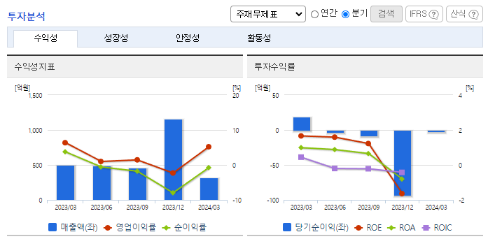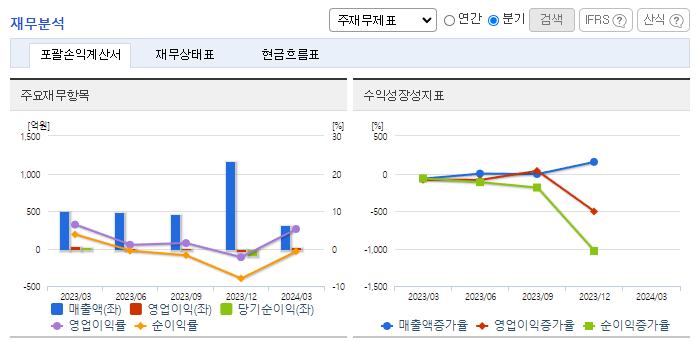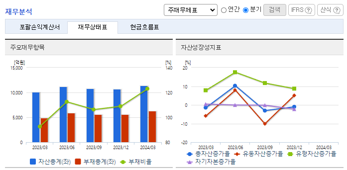 -2024년 3월 전년동기 대비 별도기준 매출액은 36.5% 감소, 영업이익은 37.3% 감소, 당기순이익은 92.3% 감소. 유지보수 매출은 지속적으로 성장 중이나 연료전지 매출의 부진으로 매출 역성장함. 영국 연료전지 업체인 세레스파워와 협력하여 2025년 4월 말까지 1,558억 원을 투자하여 50MW 규모의 셀스택 생산설비를 구축할 예정. 2025년부터 제품 양산 기대.