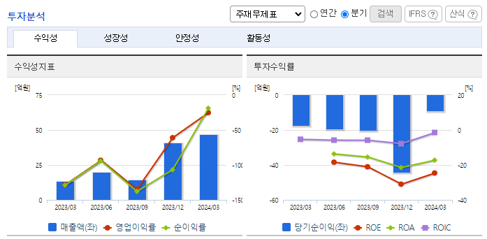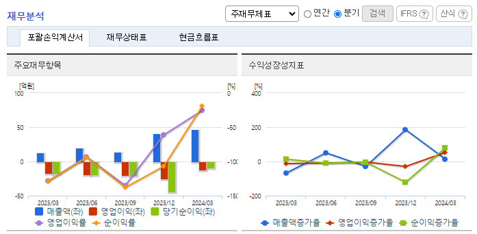 -2024년 3월 전년동기 대비 연결기준 매출액은 247% 증가, 영업손실은 32% 감소, 당기순손실은 53.8% 감소. 영화, 드라마, 광고 부문에서의 매출이 새롭게 추가됨과 동시에 매출상승에 크게 기여함. 이에 따라 회사의 수익상승에 크게 기여함. 기존 피규어 사업, 드라마 제작 사업과의 연계를 통하여 영업실적을 개선해갈 예정이며, 2024년 1분기에는 미국에 자본금을 출자하여 미국 해외법인을 설립함.