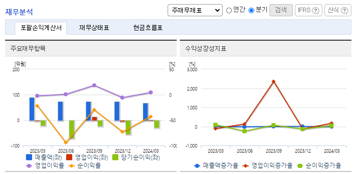 -2024년 3월 전년동기 대비 연결기준 매출액은 26.1% 감소, 영업이익 흑자전환, 당기순손실은 43.7% 증가. 지난해 2분기이후 수출 및 내수 동반 부진 계속 이어지고 있으나, 수익성 측면에서는 원가율 하락 및 판관비 절감 영향으로 개선된 모습 시현하며 흑자 전환. 동사는 완성차 업체와의 수직적 종속적 관계가 아닌 매출처가 다변화되어 있는 점이 보다 안정적 매출을 시현할 수 있는 강점임.