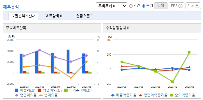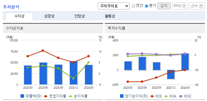 -2024년 3월 전년동기 대비 연결기준 매출액은 2.6% 증가, 영업이익은 2.9% 증가, 당기순이익 흑자전환. 반도체용 CCL매출이 증가하면서 전자 BG 사업부문에서의 실적 개선으로 전반적인 매출액 및 영업이익이 개선되었음. 매출의 가장 큰 부분을 차지하는 두산밥캣은 유럽과 아시아 시장에서의 성적은 부진하나, 주력시장인 북미지역의 판매가 견조하고 남미시장도 양호한 상황