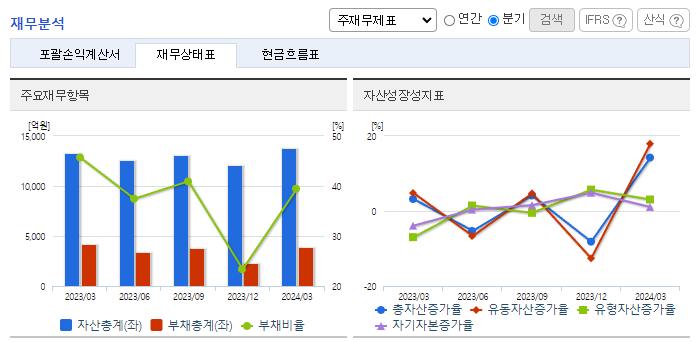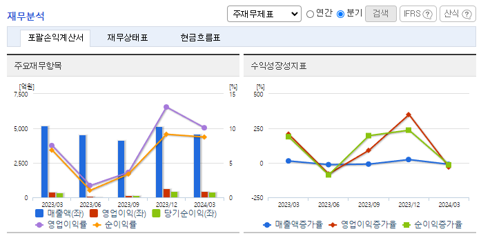 -2024년 3월 전년동기 대비 연결기준 매출액은 12.1% 감소, 영업이익은 18.1% 증가, 당기순이익은 12.3% 증가. 동사의 주요 고객인 LG디스플레이의 부진으로 매출 및 영업이익 급감하였으며 디스플레이 구동칩 DDI 가격이 하락함과 동시에 수익성도 감소하고 있음. Display 시스템 반도체 핵심 부품을 Total Solution으로 제공함은 물론 수입의존도가 높았던 제품들을 국산화하였음.