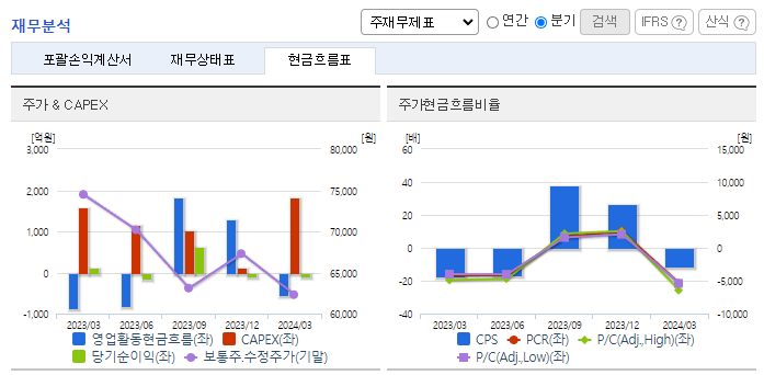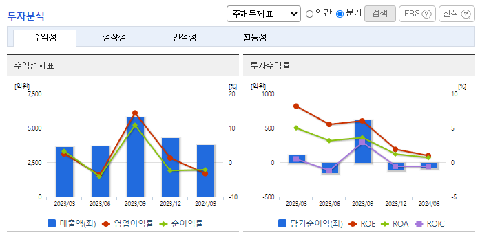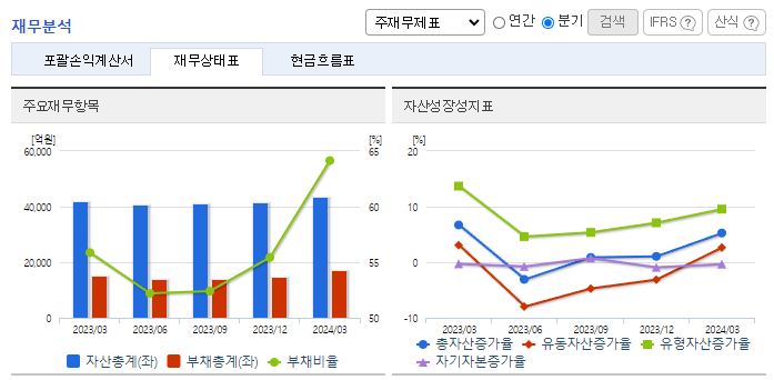 -2024년 3월 전년동기 대비 연결기준 매출액은 4.5% 증가, 영업이익 적자전환, 당기순이익 적자전환. 전년동기 대비 매출액은 4.5% 소폭 증가하였으나, 일부 제품의 원재료비 상승 및 환율 급등과 더불어 감가상각비, 운반보관비 등 판관비의 증가로 영업이익은 적자전환 하였음. 바이오 신소재 PO3G 상업설비는 연산 5,000톤 양산체제를 갖추었으며, 새로운 성장 동력으로서 본격적인 친환경 소재 시장 개척에 나설 예정임.