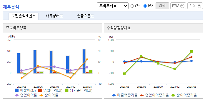 -2024년 3월 전년동기 대비 연결기준 매출액은 18.7% 증가, 영업이익은 194.3% 증가, 당기순이익 흑자전환. 지난해 글로벌 전쟁이슈, 고환율·고물가·고금리 등으로 소비시장이 크게 위축됐고 현재까지 시장수요 회복이 지연되고 있는 상황에서도 호실적을 기록하였음. 7월 파리 올림픽을 중심으로 한 각종 스포츠 대회와 블랙 프라이데이 등 대형 할인행사를 앞두고 글로벌 가전시장 성장세 전환이 전망되고 있음.
