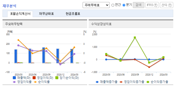 -2024년 3월 전년동기 대비 연결기준 매출액은 2.9% 증가, 영업이익 적자전환, 당기순이익은 53.8% 감소. 매출액은 전년동기 대비 소폭 증가했으나, 사료 부문 원재료 확보의 어려움이 지속되며 매출원가가 상승하고 영업손실을 기록함. 2024년 1분기 기준 매출 비중은 사료 부문 69%, 식품 부문 31%로 구성됨. 최근 연구개발 테마를 Nutrition에서 Function(고령화 실버케어 및 삶의 질 개선)으로 확대함.