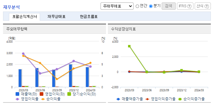 -2024년 3월 전년동기 대비 연결기준 매출액은 12.5% 증가, 영업이익은 31.2% 감소, 당기순이익은 15.8% 감소. 동사는 완성차 판매 호조에 따른 탑라인 성장, HEV 물량 확대에 따른 마진율을 개선함. 2022년 출시한 폭스바겐 전기차 전용 MEB 플랫폼 차량 ID BUZZ 의장부품 공급업체로 선정되는 등 코리아에프티는 유럽 자동차 부품 공급 파트너로 자리 잡고 있음.