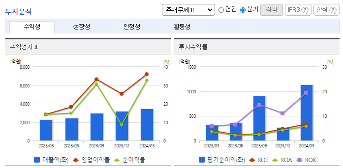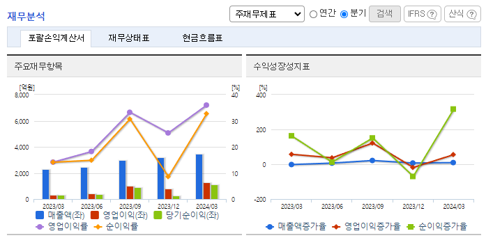 -2024년 3월 전년동기 대비 연결기준 매출액은 52% 증가, 영업이익은 286.6% 증가, 당기순이익은 252.4% 증가. 차량용 배터리 등 매출이 19.0% 증가하였으며 한국타이어앤테크놀로지 등 자회사에 대한 지분법 이익이 401.1% 증가함에 따라 전체 매출 및 수익성이 크게 증가함. 글로벌 프리미엄 성장 전략, 미국 테네시 공장의 안정화에 따른 수익성 개선 등 여러 긍정적 요인이 결합된 시너지 효과.