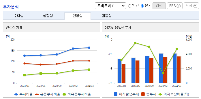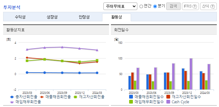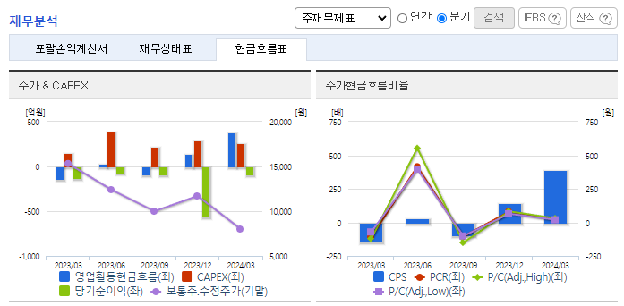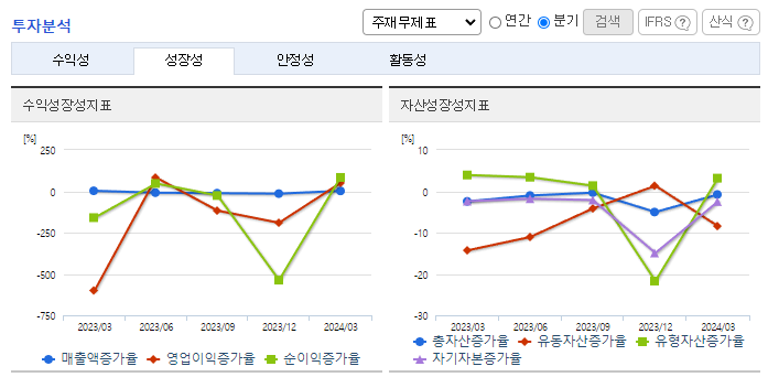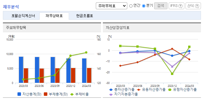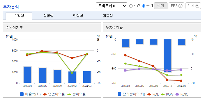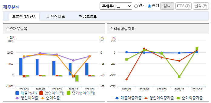 -2024년 3월 전년동기 대비 연결기준 매출액은 29.1% 감소, 영업손실은 46% 감소, 당기순손실은 87.1% 증가. 지속되는 불안정한 경제 환경 속 중국 등 글로벌 이차전지 시장 침체 등에 따른 이차전지 소재 판매 감소로 동사의 실적이 감소하였음. 미·중 외교 및 경제갈등과 유럽 및 중동에서의 전쟁상황 등으로 인한 국내외 경기 침체 및 전방산업 둔화로 인한 이차전지소재 판매 및 반도체 특수가스 판매 감소.