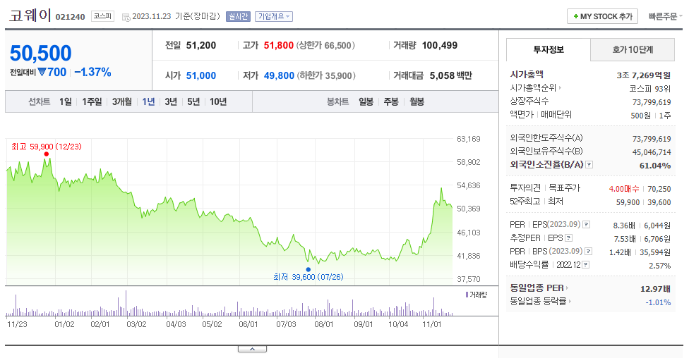 코웨이 현재 주가는 50,500원이며 전일 대비 -700(-1.37%)원의 모습을 보이고 있습니다. 코웨이의 주주현황을 살펴보면 넷마블(외 7인)이 지분 25.10%를 소유하고 있습니다. 코웨이는 내구소비재 기업으로 장중 기준으로 주가는 51,200원 입니다. 코웨이의 시가 총액은 3조7269억 원이며 발행 주식수는 73,799,619주 입니다. 외국인 보유 비중은 61.04% 이며 장중 거래량은 100,499를 기록했습니다. 23년 3분기 매출액은 10,077억 원, 영업이익은 1,953억 원을 달성했으며, EPS는 1,856원입니다. 코웨이 주식 배당수익률은 2.57% 입니다.