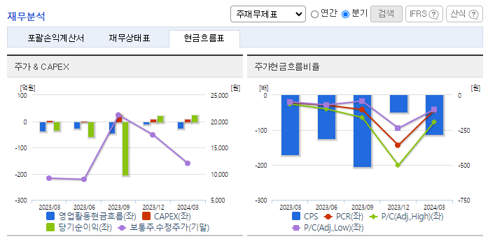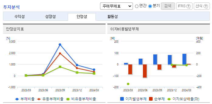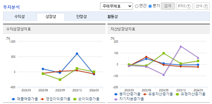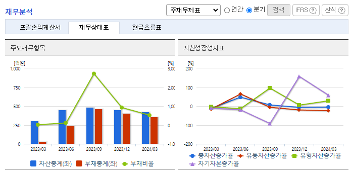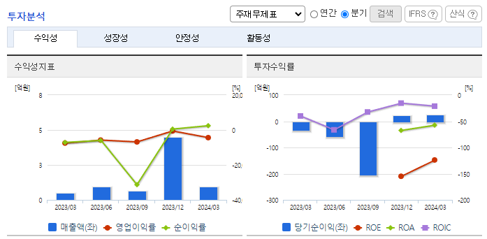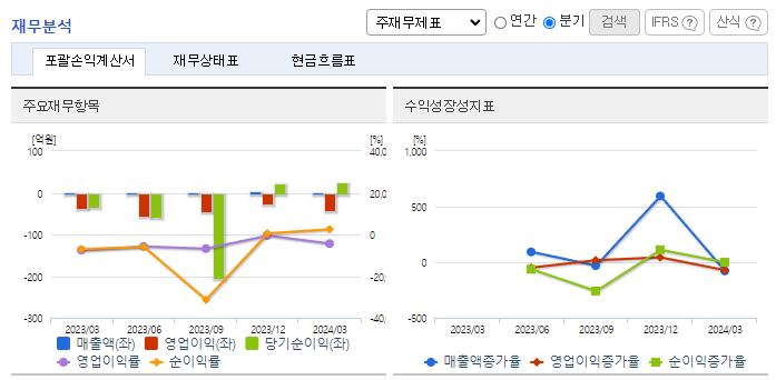 -2024년 3월 전년동기 대비 별도기준 매출액은 98% 증가, 영업손실은 16% 증가, 당기순이익 흑자전환. 기술이전 및 용역 매출액이 증가함에도 연구개발비 및 지급수수료와 같은 판관비 및 인건비 또한 증가하여 영업손실폭이 확대됨. Joint Development (공동개발 및 사업화) 사업모델에서 국내외 유수의 학회에 당사 기술에 대한 연구 논문 발간 통한 전문가 수준의 홍보에 노력.