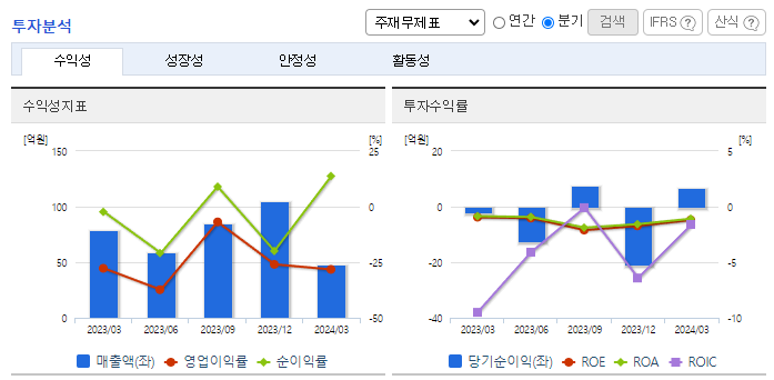 -2024년 3월 전년동기 대비 연결기준 매출액은 38.9% 감소, 영업손실은 37.8% 감소, 당기순이익 흑자전환. ODM 방식의 블루투스 이어폰 공급 사업이 지속적으로 축소되고 있으나 원가절감 등으로 영업손익 개선, 외화환산이익, 수입임대료 등으로 순손익은 흑자전환. 동사는 당기 결산일 이후 중장기 성장 발판 마련을 위한 청라 사옥 신축을 위해 219.8억 원의 신규 시설 투자, 379.5억 원 규모의 토지 양수 계약을 공시함.